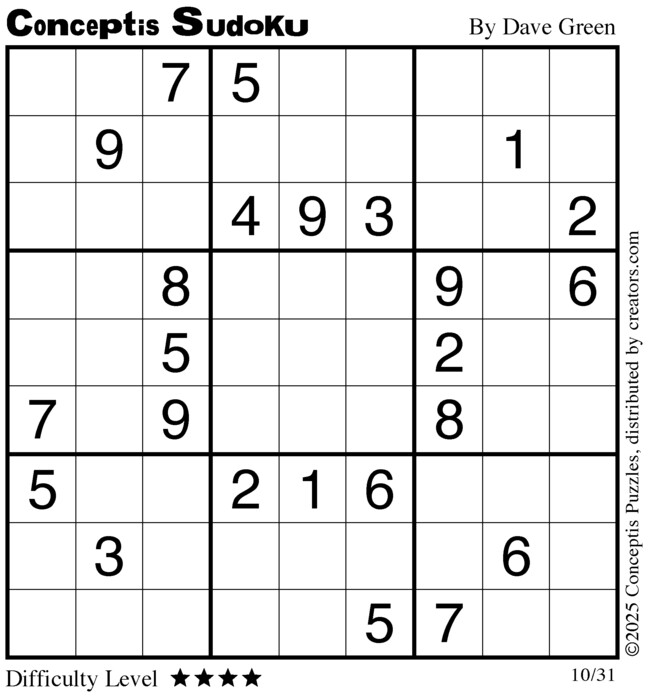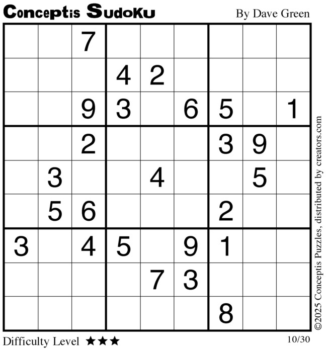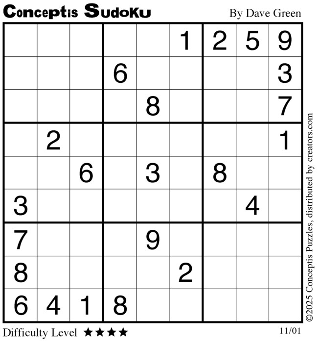 Each puzzle consists of a 9x9 grid containing given clues in various places. The object is to fill all empty squares so that the numbers 1 to 9 appear exactly once in each row, column and 3x3 box.