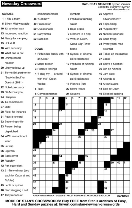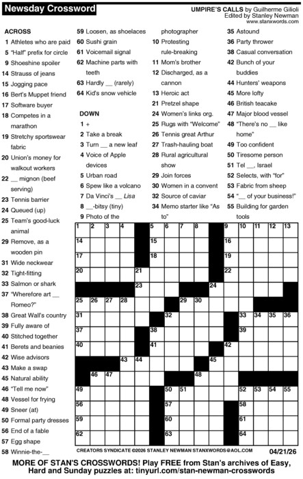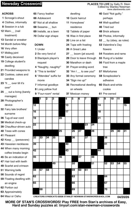 Because free access to the content of Newsday.com is available only to Newsday subscribers and customers of Cablevision (Newsday’s owner), many thousands of puzzle fans, spanning six continents, get the Newsday Crossword free every day right here at Stan’s Crossword Land.
