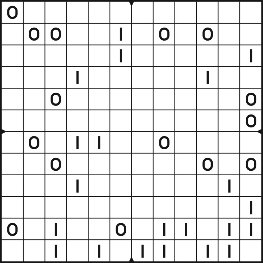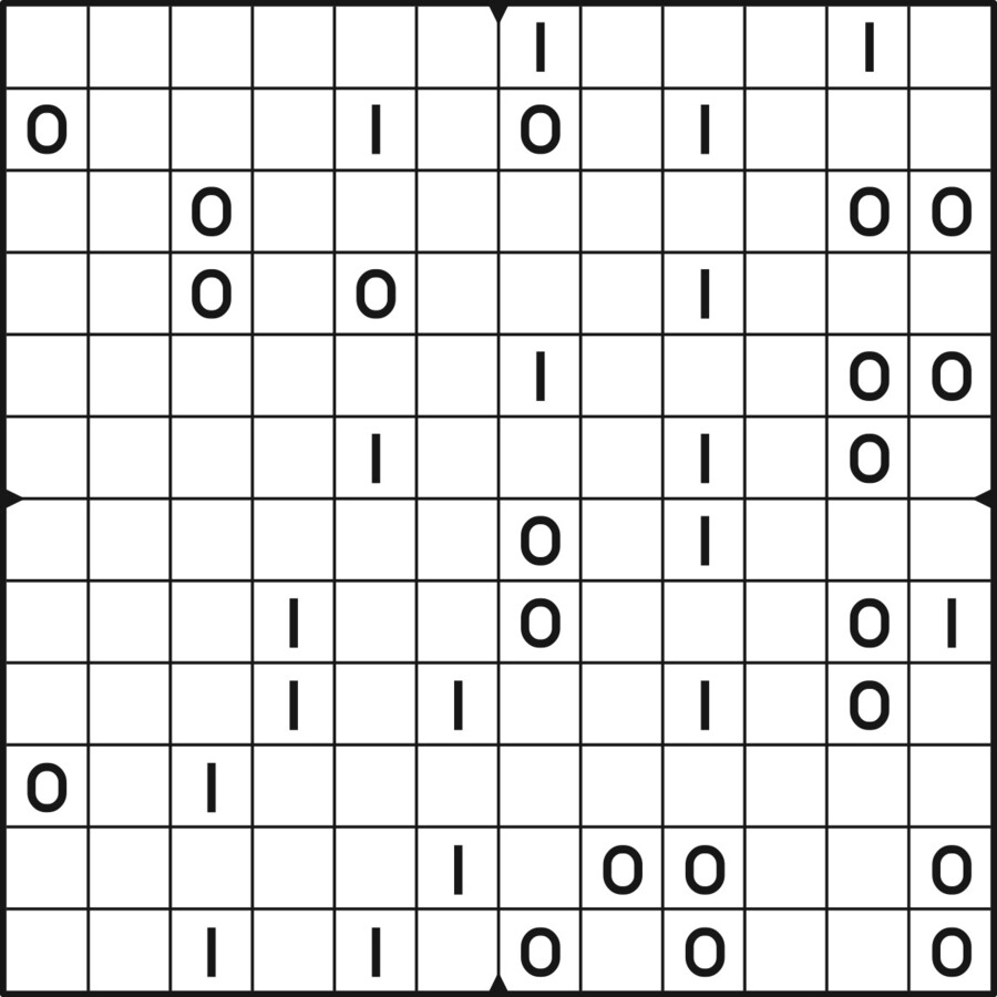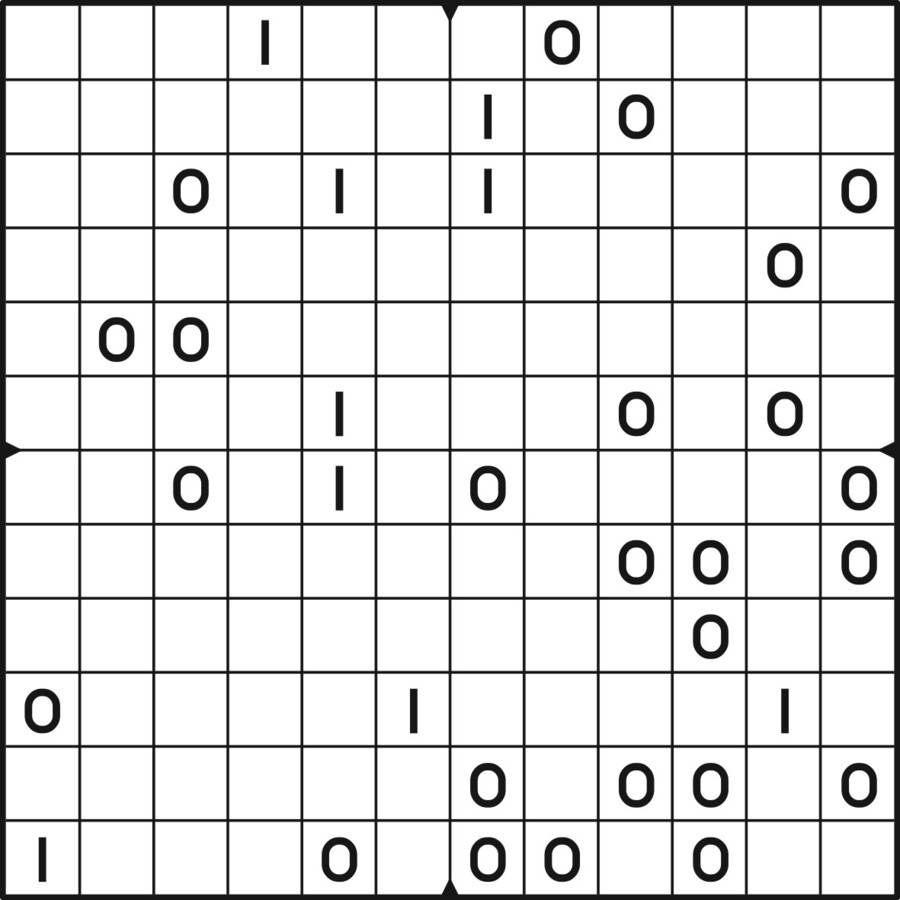 A daily binairo puzzle! Solve each puzzle with only 0's and 1's. Remember: No more than two the same numbers may be placed directly next to or below each other. Every row and every column must contain as many zeroes as ones. The combination of zeroes and ones in every row must be unique, as does the combination in each column.