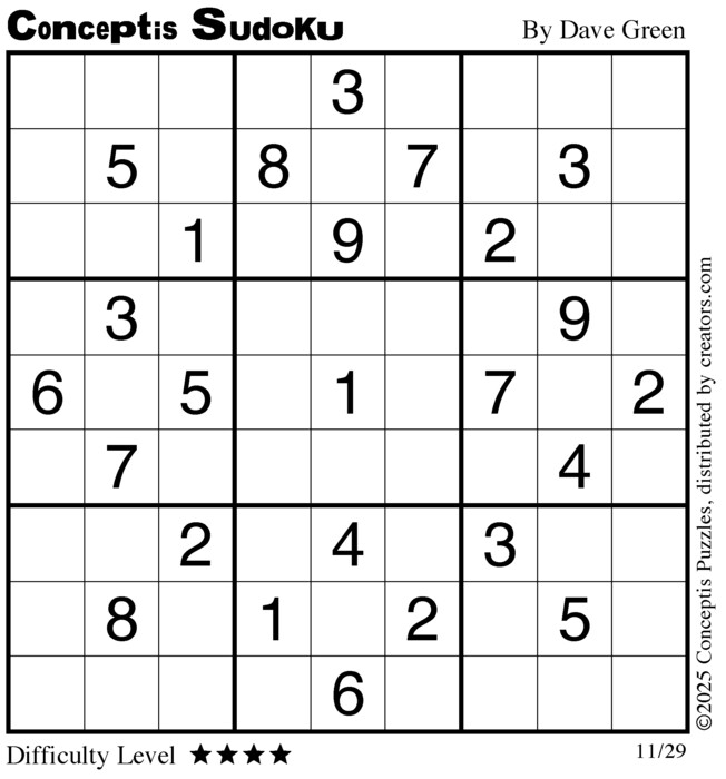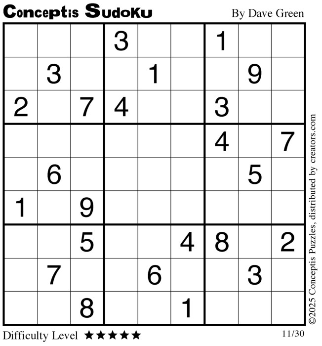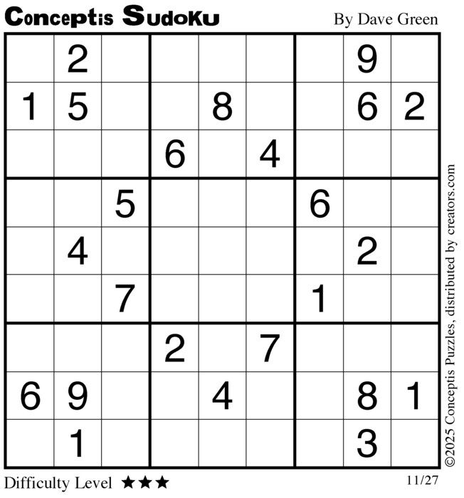 Each puzzle consists of a 9x9 grid containing given clues in various places. The object is to fill all empty squares so that the numbers 1 to 9 appear exactly once in each row, column and 3x3 box.