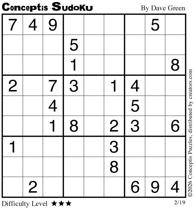 Conceptis Classic Sudoku for Feb 19, 2026