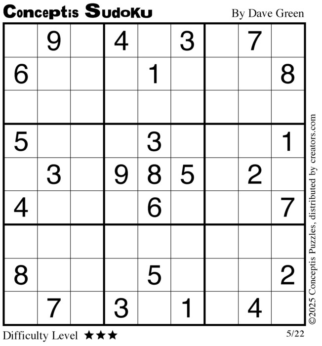 Conceptis Classic Sudoku for May 22, 2025