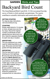 Bird feeders filled with seeds will help some birds make it through the coldest nights. To find out an approximate number of the birds that have survived over the winter, and before many migrant birds start arriving from the tropics, the Cornell Lab of Ornithology operates the Great Backyard Bird Count. This year, it will take place February 13-16.
