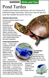 Of the seven groups of turtles native to our rivers and ponds, only a couple are easily kept in a backyard water garden. They tend to have two problems: Either they run away, or they eat the plants and fish in the pond.