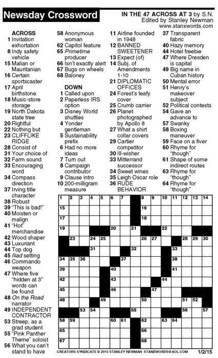 Newsday Crossword Puzzle for Jan 02, 2015