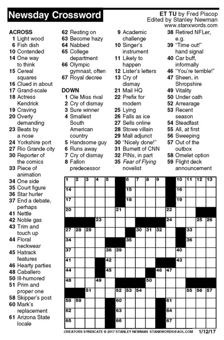 Newsday Crossword Puzzle for Jan 12, 2017