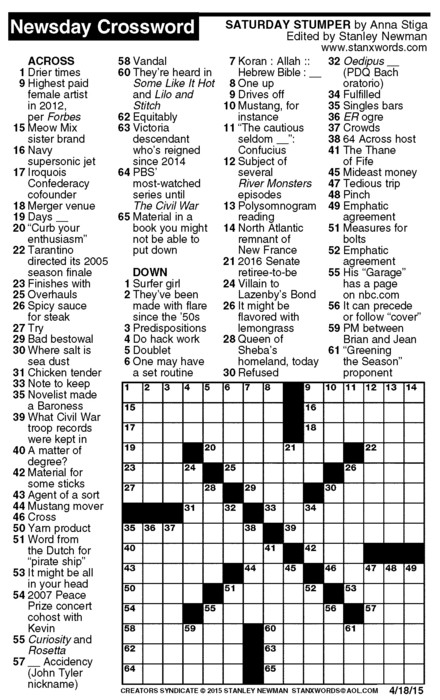 Newsday Crossword Puzzle for Apr 18, 2015