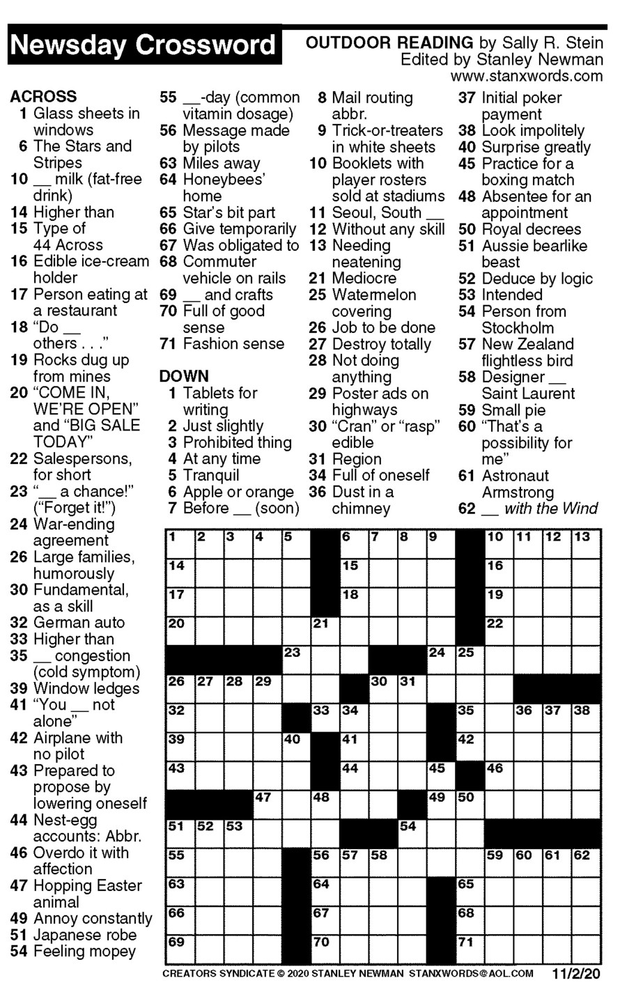 Newsday Crossword Puzzle for Nov 02, 2020